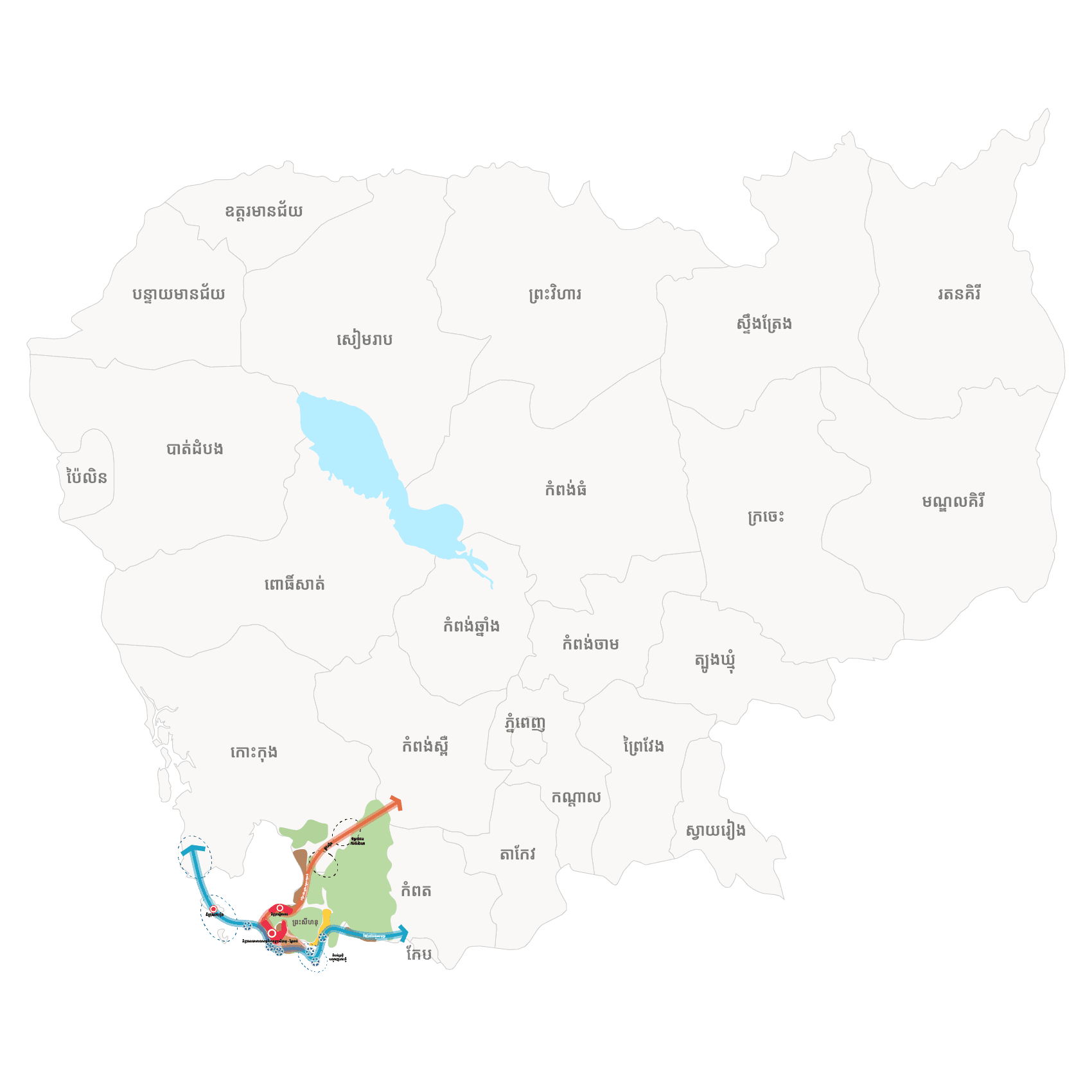 Preah Sihanouk, Koh Kong, Kampot and Kep are the four Cambodia coastal provinces charmed with natural beauty and investment opportunities. Uncover this potential, where land meets limitless opportunity, stunning natural landscapes with strategic locations ideal for tourism, trade, industrial development and sustainable investment.